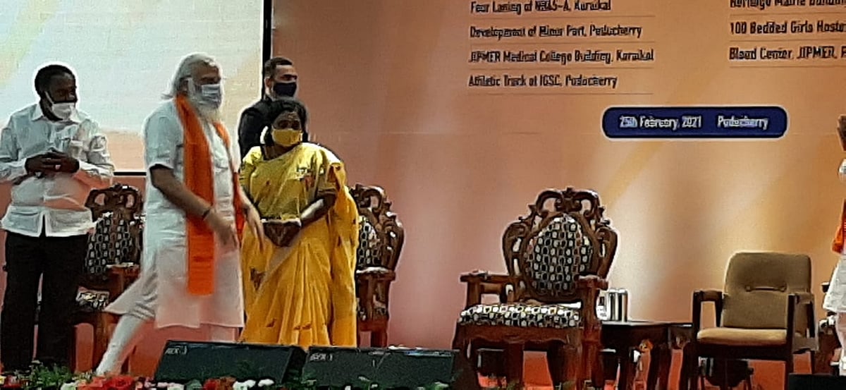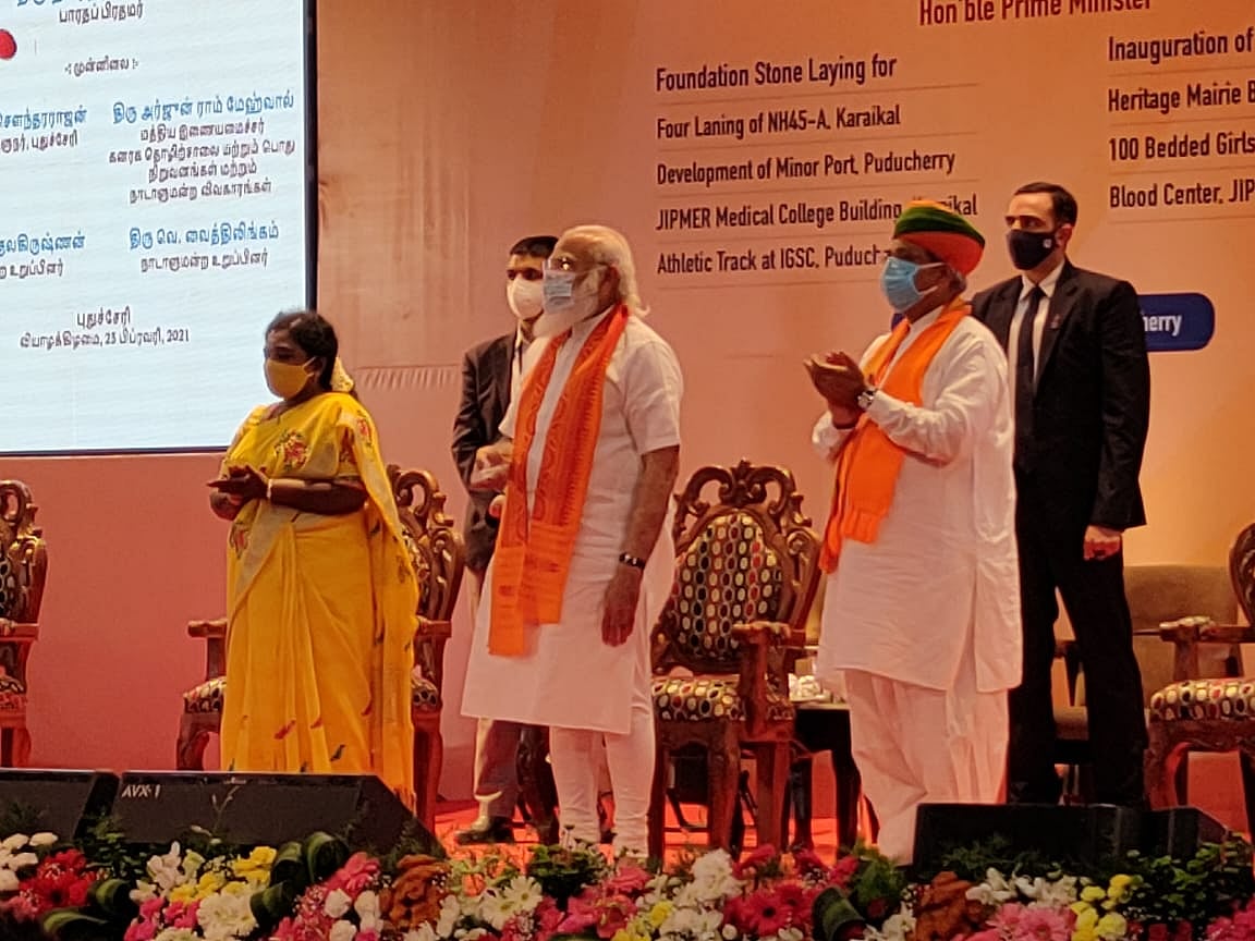 என்ற திருக்குறளுக்கேற்ப கற்றலும் கல்வியும் விலை மதிப்பில்லாதது. மற்றது நிலையற்றது. அதன் ஒருபடியாகத்தான் காரைக்கால் ஜிப்மர் வளாகம். அங்கு கட்டப்படவிருக்கும் நவீன வசதியை கொண்டிருக்கும். கடற்கரை புதுச்சேரியின் உயிர்நாடி. கடல் சார்ந்த பொருளாதாரத்தில் நிறைய வாய்ப்புகள் உள்ளன. சாகர்மாலா திட்டத்தில் மூலம் புனரமைக்கப்பட இருக்கும் துறைமுகம் பெரிய உதவியாக இருக்கும். சென்னையுடன் கடல்வழி தொடர்பை ஏற்படுத்தும். சென்னை துறைமுகத்தின் சுமையும் குறையும். கடற்கரை நகரங்களுக்கு இடையிலான பயணிகள் போக்குவரத்து சாத்தியத்தை திறந்து வைக்கும். நேரடி பணபரிமாற்ற முறையால் சுய முடிவு எடுக்கும் வசதி புதுச்சேரி மக்களுக்கு உள்ளது. புதுச்சேரி முன்னேற்றத்துக்கு எனது அரசு அனைத்து உதவிகளையும் மேற்கொள்ளும் என்பதை உத்திரவாதப்படுத்தவே நேரடியாக வந்திருக்கிறேன்” என்றார்.