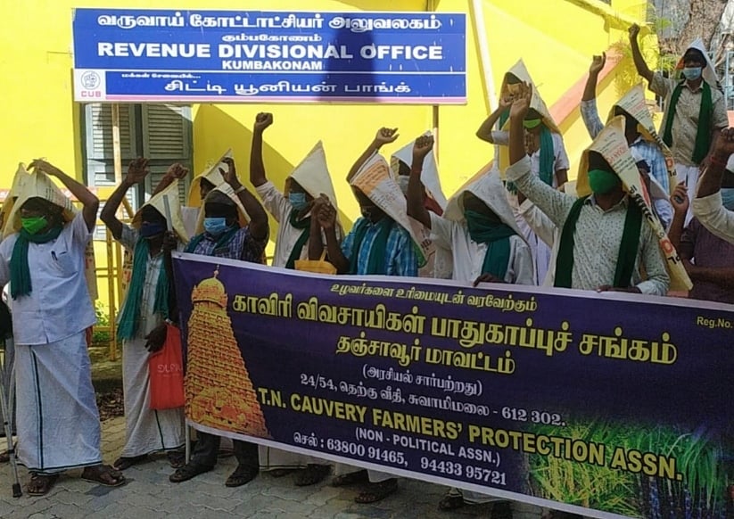 இந்நிலையில்தான், உரங்களை பதுக்கி வைத்து அநியாய விலைக்கு விற்பனை செய்யும் தனியார் உரக்கடைகள் மீது நடவடிக்கை எடுக்க வலியுறுத்தியும், இப்பிரச்னையை பற்றி கண்டுகொள்ளாமல் வேடிக்கை பார்த்துக் கொண்டிருக்கும் தஞ்சை மாவட்ட நிர்வாகத்தை கண்டித்தும் தஞ்சை மாவட்டம் கும்பகோணம் வருவாய் கோட்டாட்சியர் அலுவலகம் முன்பு விவசாயிகள் ஆர்ப்பாட்டம் நடத்தினர். தங்களது தலையில் காலி உர சாக்குகளை முக்காடுபோல அணிந்து தங்களது கண்டனத்தை வெளிப்படுத்தும் விதமாக நூதன போராட்டமும் நடத்தினர். இதுதொடர்பான கோரிக்கை மனுவை கும்பகோணம் கோட்டாட்சியரிடம் விவசாயிகள் வழங்கினர்.