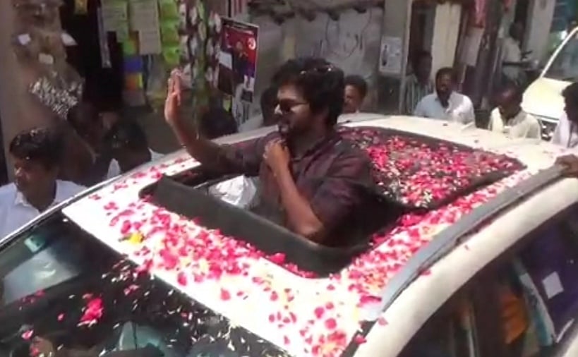 மாஸ்டர் படக் காட்சி போல சாலையில் வேகமாக ஓடி வந்து டவுன் பஸ்ஸில் ஏறி பயணிகளை ஆச்சரியப்படுத்துகிறார். அப்படியே அவர்களிடம் வாக்கு கேட்கிறார். பின்பு சைக்கிளில் வருகிறார். `தளபதி! தளபதி!' என்று கோஷமிட்டபடி ரசிகர்கள் பின்னாலயே ஓடி வருகிறார்கள்.