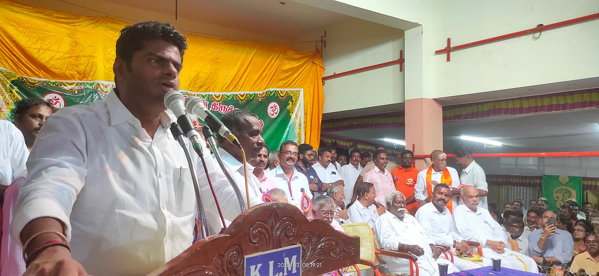 கன்னியாகுமரி மாவட்டம் மண்டைக்காடு பகவதி அம்மன் கோயில் மாசி கொடைவிழாவின் 10-வது விழாவில் ஹைந்தவ சேவாசங்கம் சார்பில் நடந்த 85-வது இந்து சமய மாநாட்டில் பா.ஜ.க தலைவர் அண்ணாமலை கலந்துகொண்டார். ஏழைகளுக்கு நலத்திட்ட உதவிகளை தொடங்கி வைத்து அண்ணாமலை பேசுகையில், ``நடந்து முடிந்த உள்ளாட்சி தேர்தலில் குமரி மாவட்டத்தில் பா.ஜ.க-வினர் அதிகமாக வெற்றிபெற்றுள்ளனர். தமிழ்நாடு அளவில் பா.ஜ.க 3-வது கட்சியாக வளர்ந்துள்ளது. தி.மு.க கூட்டணியில் 13 கட்சிகள் உள்ளன. பா.ஜ.க தனியாக வளர்ந்துள்ளது. உக்ரைன் நாட்டு போர் சூழலில் நமது பிரதமர் மோடி ரஷ்யா, உக்ரைன் அதிபர்களிடம் ஒரே நேரத்தில் பேசக்கூடிய வல்லமை பெற்றவர். உக்ரைனில் இருந்து 12,000 மாணவர்களை பிரதமர் மீட்டுள்ளார். பாகிஸ்தான், சீனா மாணவர்கள் கூட நம் இந்திய நாட்டின் மூவர்ண கொடியை காட்டி ஊர் திரும்பியுள்ளனர். இதற்கு உலக அரங்கில் பிரதமர் மோடிக்கு இருக்கும் மதிப்பே காரணம்.