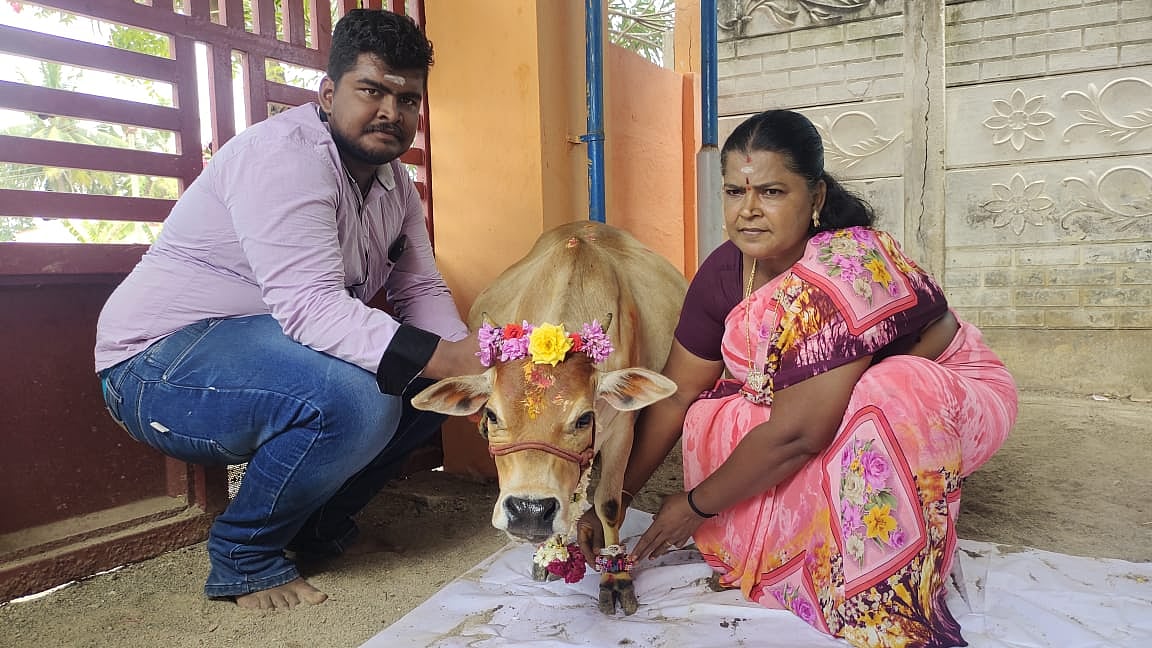 "படிக்கிற காலத்துல இருந்தே மாடுகள் வளர்க்கிறது ரொம்பவே பிடிக்கும். அப்ப தாத்தா பாட்டி வீட்டுல அதிகமா மாடுகள் இருக்கும். இப்போ 10 வருஷமா தனியா மாடுகள் வளர்த்துக்கிட்டு இருக்கேன். 10 வருஷமா தஞ்சாவூர் குட்டை இன பசு மாடுகளாக வாங்கி வளர்த்துக்கிட்டு இருக்கேன். கன்று ஈன்றதுக்கு அப்புறமோ, யாராவது ரொம்ப விருப்பப்பட்டு கேட்டாலோ கொடுத்திட்டு, அடுத்த குட்டை ரக மாட்டை வாங்கிட்டு வந்திடுவேன். அப்படி ஏற்கெனவே இருந்த ஒரு பசுவைக் கொடுத்ததுக்கு அப்புறம், காரைக்குடி பக்கத்துல இருக்க பள்ளத்தூர்ல இருந்துதான் இந்த குட்டை பசு மாட்டை வாங்கிட்டு வந்தேன். நான் வாங்கிட்டு வரும்போது 3 வயசு இருக்கும். வாங்கி வந்து இப்போ ஒன்றரை வருஷமாகுது. தூத்துக்குடி அமிர்தம் ஒருங்கிணைந்த பண்ணையில் ராஜேஷ் என்பவருடைய காளையோட இணை சேர்த்தோம். அதன்பிறகு சினையாகி இப்போ 9 மாதங்கள் ஆகி இருக்கு.
