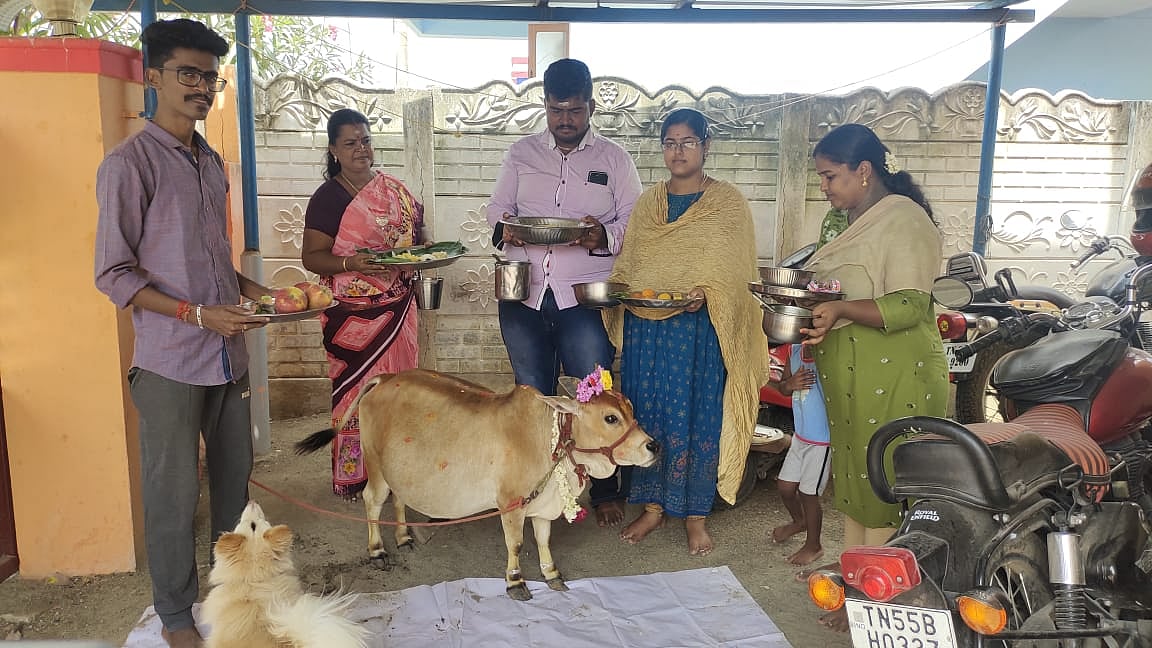 இந்த பசு மாட்டோடு, ஜல்லிக்கட்டு காளைகளையும் வளர்த்திட்டு வர்றேன். பொதுவாகவே எங்க வீட்டுல யாருக்கும் மாடு வளர்ப்பு பெருசா பிடிக்காது. தனியாகவோ, நண்பர்கள் வீட்டிலோ வச்சு தான் வளர்த்துக்கிட்டு இருந்தேன். இந்த குட்டை மாட்டை வாங்கிட்டு வந்ததுகப்புறம் எல்லாருக்கும் பிடிச்சிப்போச்சு. எங்கம்மா இந்த மாட்டை மகளாகவே பார்க்க ஆரம்பிச்சிட்டாங்க. சக்தி குட்டை மாடு வந்ததுகப்புறம் வீட்டுலயே வச்சி வளர்க்க ஆரம்பிச்சேன். எங்க வீட்டுக்குள்ள எங்களோடே தான் இருக்கும். பிள்ளை மாதிரி வளர்த்திட்டோம். அதனால, வளைகாப்பு நடத்தலாம்னு அம்மாதான் சொன்னாங்க. இன்னைக்கு சிறப்பா வளைகாப்பு நடத்தி முடிச்சிருக்கோம். இந்த குட்டை ரக மாட்டுக்கு தீவனச் செலவு ரொம்பவே குறைவு. பலரும் இந்த ரக மாட்டுல பால் குறைவா கிடைக்கும்னு நினைக்கிறாங்க.