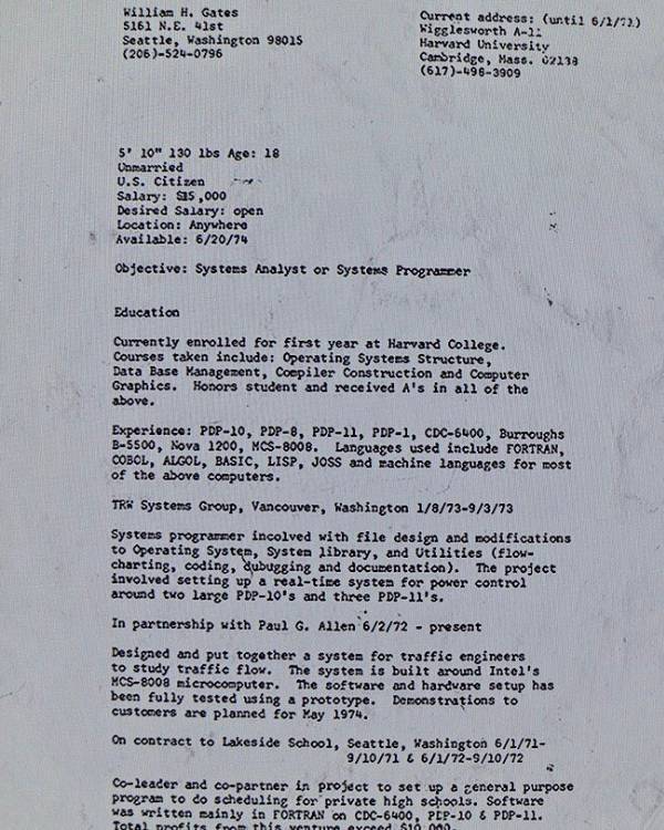 மேலும் FORTRAN, COBOL, ALGOL, BASIC, போன்ற அனைத்து முக்கிய கம்ப்யூட்டர் மொழிகளிலும் தனக்கு அனுபவம் இருப்பதாக பில்கேட்ஸ் தனது ரெஸ்யூமில் கூறியுள்ளார். மேலும் கடந்த 1973ஆம் ஆண்டு TRW சிஸ்டம்ஸ் குழுமத்தில் கணினி புரோகிராமராக இருந்த அனுபவத்தையும் அவர் கூறியுள்ளார். பில்கேட்ஸ் 1972ஆம் ஆண்டு சியாட்டிலில் உள்ள லேக்சைட் பள்ளியில் இணைத் தலைவர் மற்றும் இணை பங்குதாரராக இருந்த தனது பணியையும் பகிர்ந்து கொண்டார்.