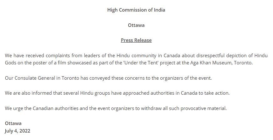 இந்நிலையில் கனடாவின் ஒட்டாவா நகரில் செயல்படும் இந்திய உயர் ஆணையம் அறிக்கை ஒன்றை வெளியிட்டுள்ளது. அதில் "கனடாவின் டொரோண்டோவில் உள்ள 'Aga Khan Museum' அருங்காட்சியகத்தில் 'அண்டர் தி டென்ட்' திட்டத்தின் ஒரு பகுதியாகக் காட்சிப்படுத்தப்பட்ட படத்தின் போஸ்டரில் இந்துக் கடவுள்கள் அவமரியாதையாகச் சித்திரிக்கப்பட்டுள்ளது என்று கனடாவில் வசிக்கும் இந்து சமுதாயத்தைச் சேர்ந்த தலைவர்கள் புகார்கள் அளித்துள்ளனர். இந்தியத் தூதரகமும் இதுகுறித்துக் கவலை தெரிவித்துள்ளது. இது போன்ற வெறுக்கத்தக்க விஷயங்களைத் திரும்பப் பெற வேண்டும் என்று கனேடிய அதிகாரிகளையும் நிகழ்ச்சி ஏற்பாட்டாளர்களையும் கேட்டுக்கொள்கிறோம்" என்று அதில் தெரிவிக்கப்பட்டுள்ளது.