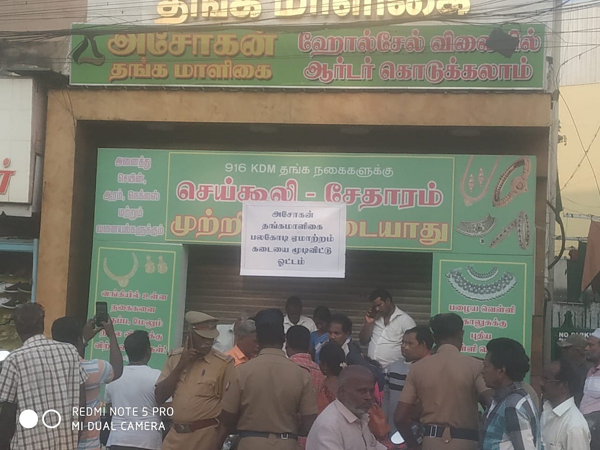 இந்த நிலையில், அசோகன் தங்கமாளிகையின் அனைத்து கடைகளையும் பூட்டிவிட்டு அதன் உரிமையாளர் தலைமறைவாகிவிட்டார். இதன் மூலம், அவர் பல கோடி ரூபாய் மோசடி செய்திருப்பதும் தற்போது தெரியவந்திருக்கிறது. கடை இருந்த அனைத்து ஊர்களிலும் ஏமாற்றப்பட்ட வாடிக்கையாளர்கள் புகார் கொடுப்பது தொடர்கிறது. இதனால் பெரும் பரபரப்பு ஏற்பட்டிருக்கிறது.