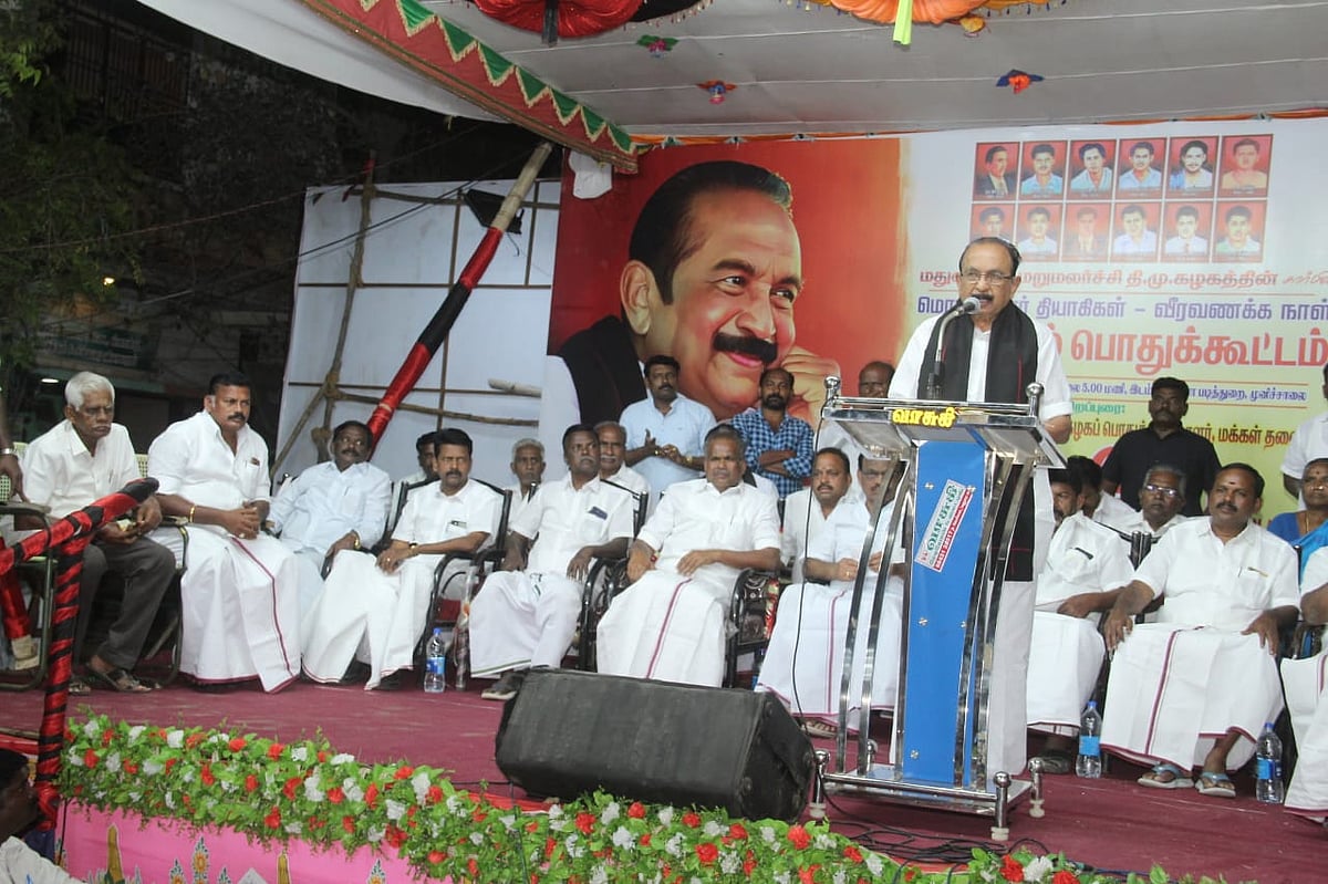 ம.தி.மு.க சார்பில் நேற்று மாலை மதுரையில் நடைபெற்ற மொழிப்போர் தியாகிகள் வீரவணக்க நாள் பொதுக்கூட்டத்தில் வைகோ கலந்துகொண்டார். அப்போது பேசிய அவர், "தமிழ்நாட்டுக்கு மீண்டும் மொழிப்போர் ஆபத்து ஏற்பட்டிருக்கிறது, தமிழைக் காக்க உயிர்த்தியாகம் செய்த மொழிப்போர் தியாகிகள் மீண்டும் பிறக்க வேண்டும்.